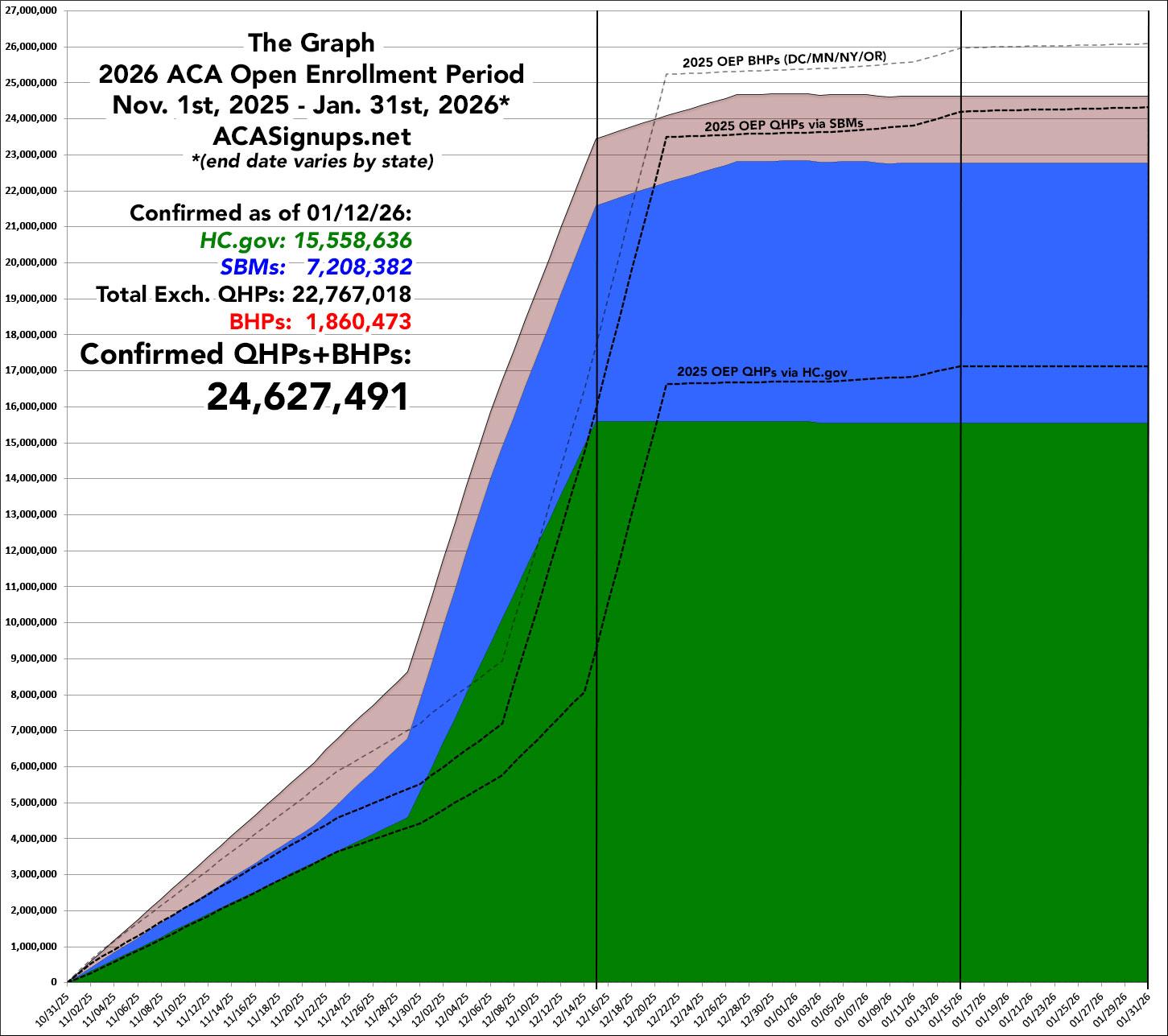 UPDATE: Here's The Graph® as of today; the SBM total is slightly different than the tallies above because this includes more recent data for a few states (remember, the CMS report only runs through 12/27 for the state-based exchanges). In fact, the SBM total is already 7,829 lower than the official total above, a small red flag of what I warned about a couple of weeks ago...
