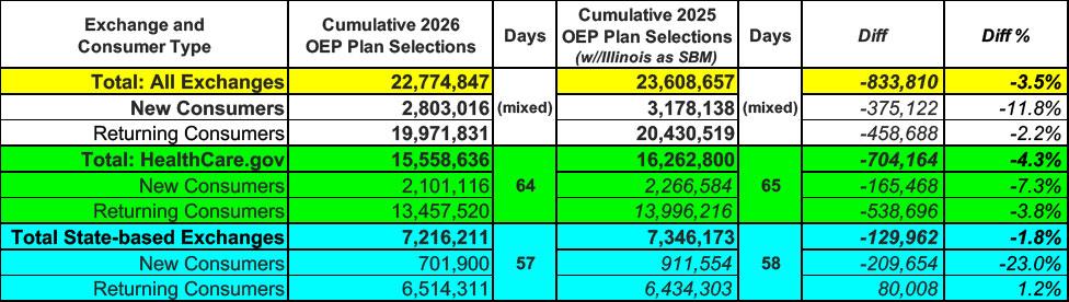 Breaking: CMS posts claimed 2026 Open Enrollment: 22.8M QHPs, down 3.5% y/y so far