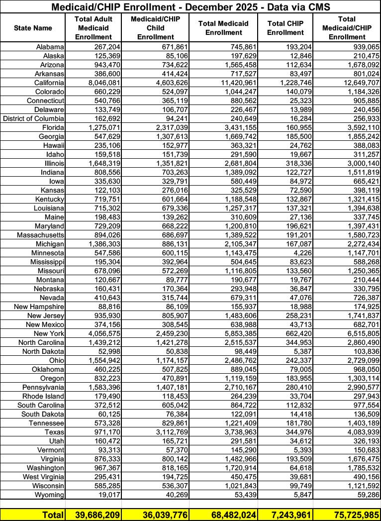 CMS posts claimed December 2025 Medicaid/CHIP enrollment report: 75.7M, down 3.7M since December 2024