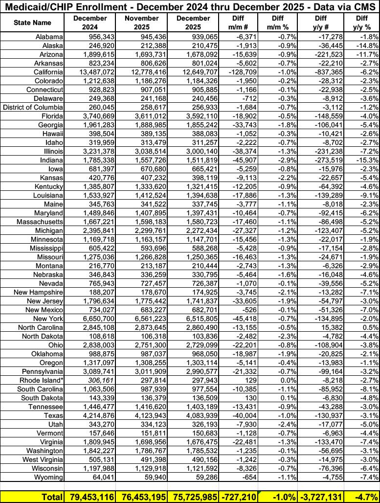 Between December 2024 and December 2025, net Medicaid/CHIP enrollment has dropped by around 3.73 million, or 4.7%.