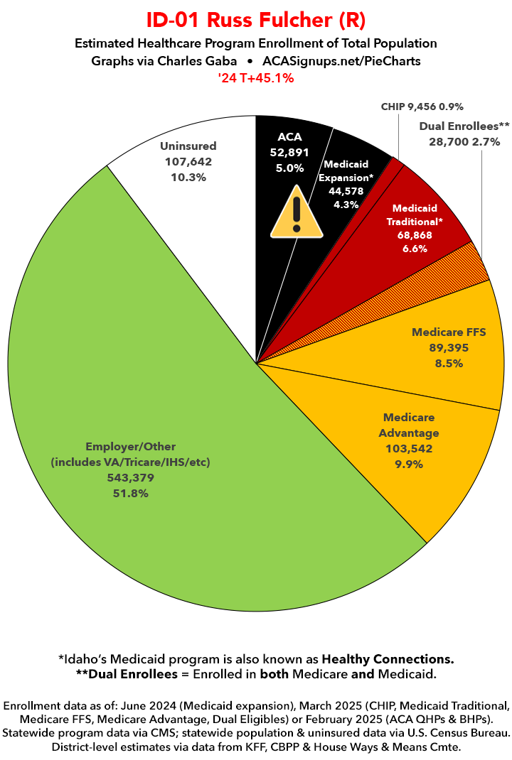 UPDATE 7/3/25: I've updated the web versions of the graphics with the most up-to-date enrollment data I have access to. The black sections w/the ⚠️ symbol are those most at risk of losing healthcare coverage due to H.R. 1, the "One Big Beautiful Bill Act" (aka the #MAGAMurderBill).