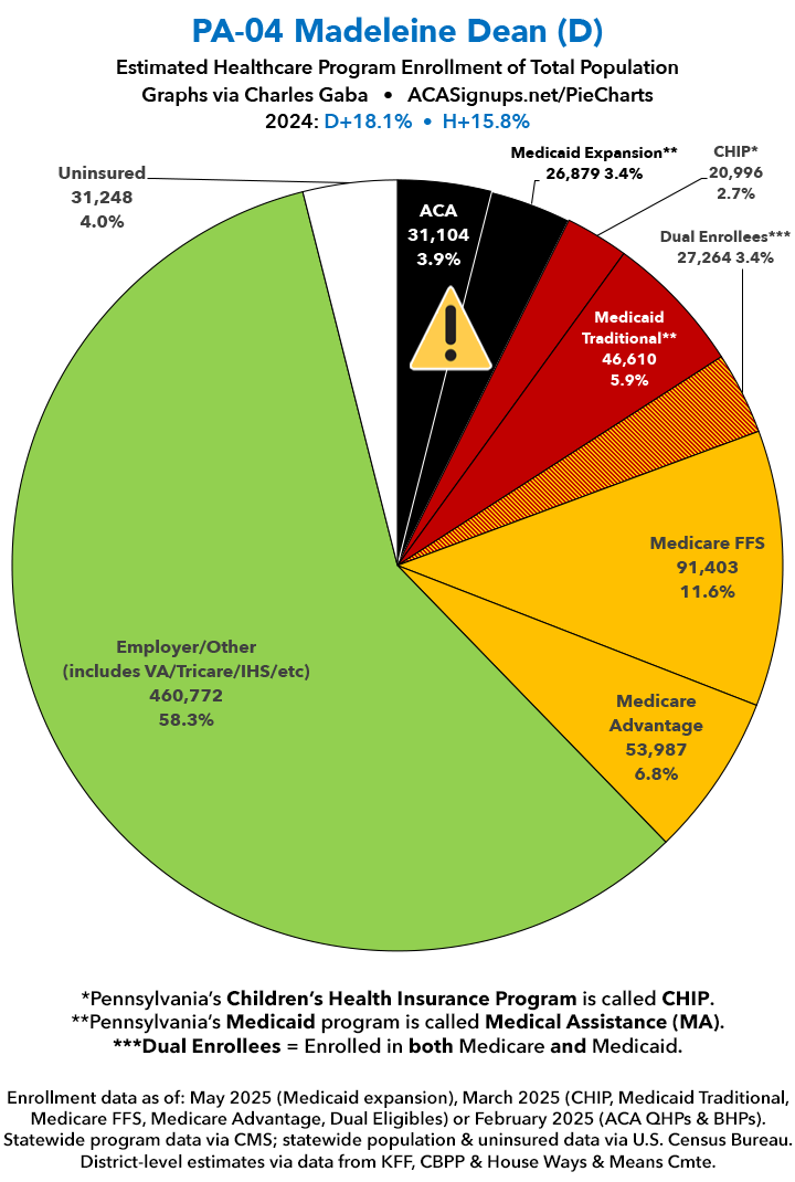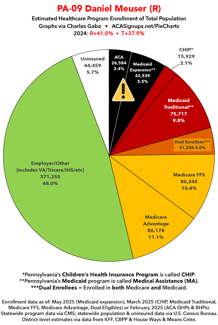 UPDATE 7/11/25: I've updated the web versions of the graphics with the most up-to-date enrollment data I have access to. The black sections w/the ⚠️ symbol are those most at risk of losing healthcare coverage due to H.R. 1, the "One Big Beautiful Bill Act" (aka the #MAGAMurderBill).