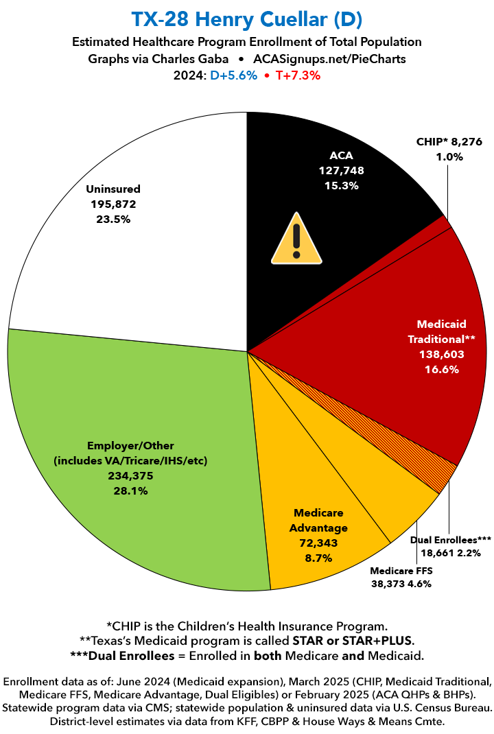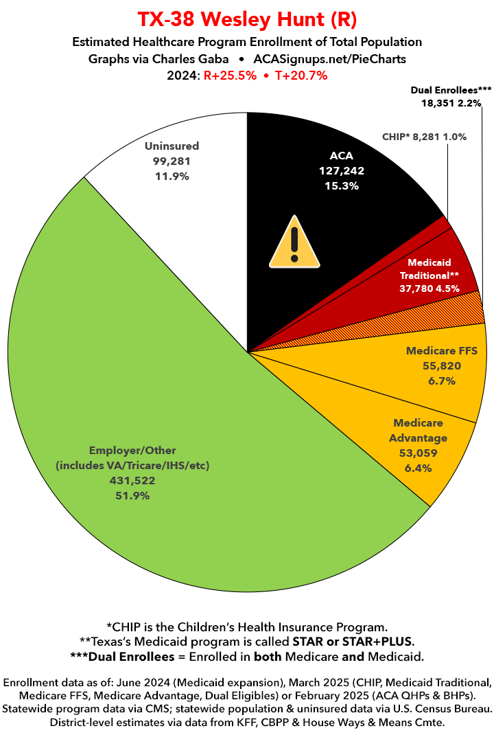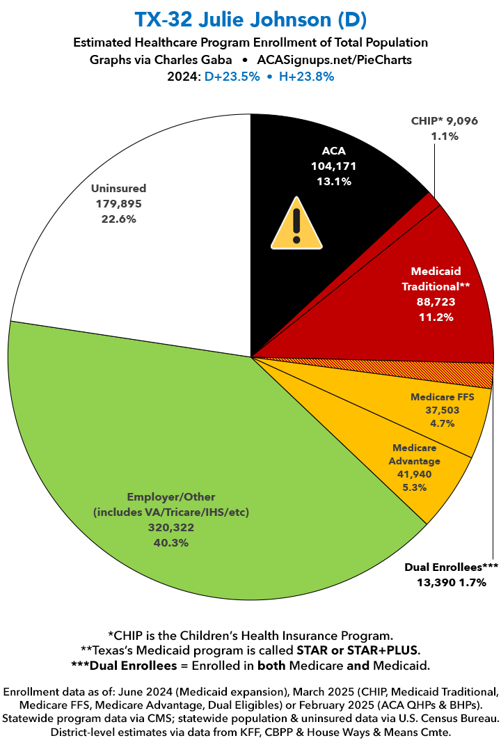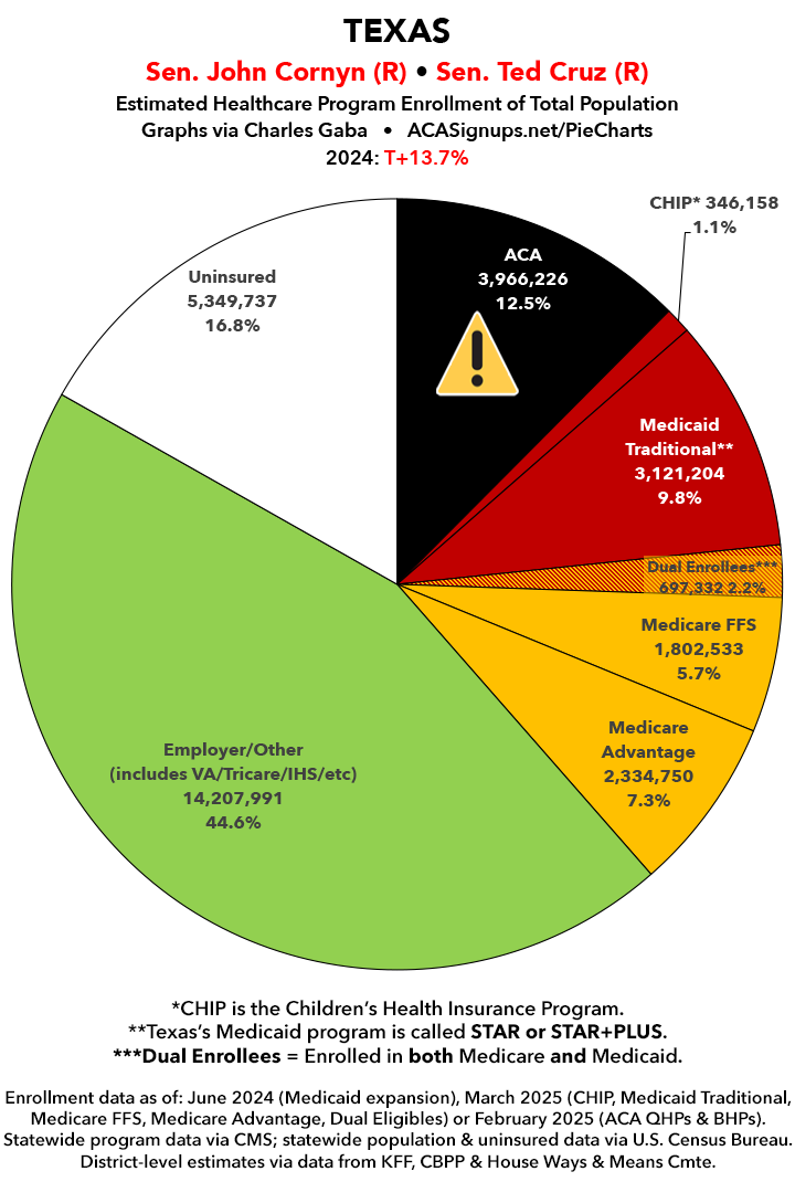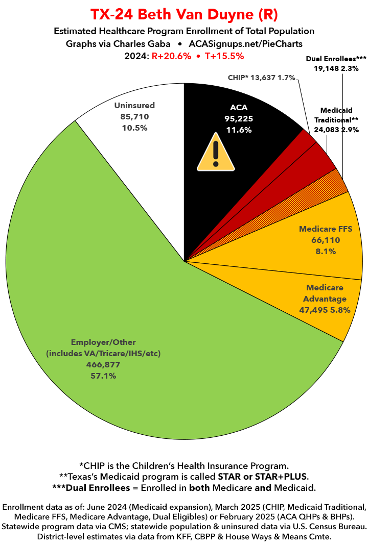 UPDATE 7/14/25: I've updated the web versions of the graphics with the most up-to-date enrollment data I have access to. The black sections w/the ⚠️ symbol are those most at risk of losing healthcare coverage due to H.R. 1, the "One Big Beautiful Bill Act" (aka the #MAGAMurderBill).