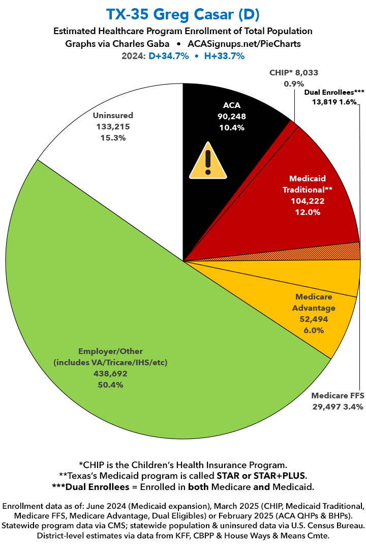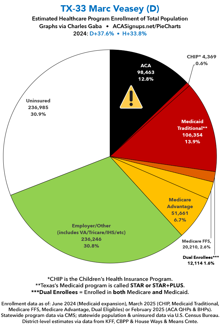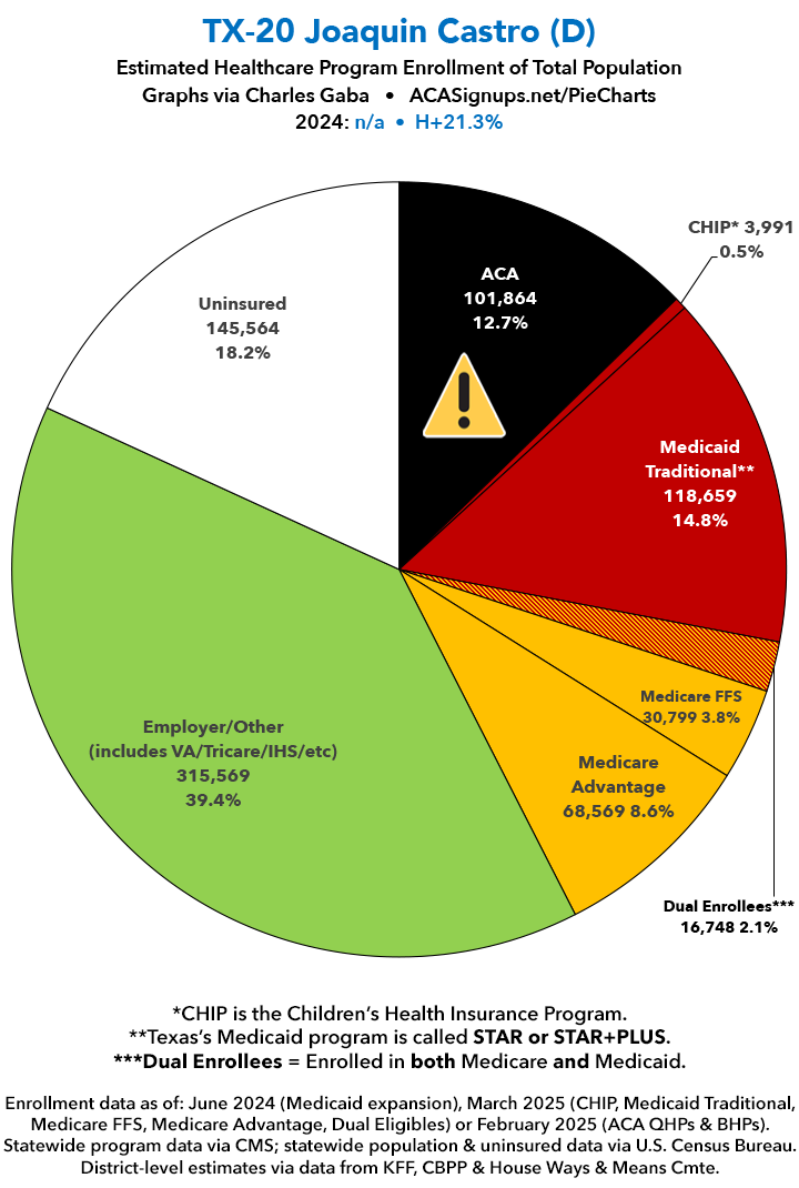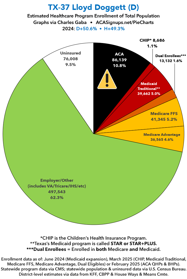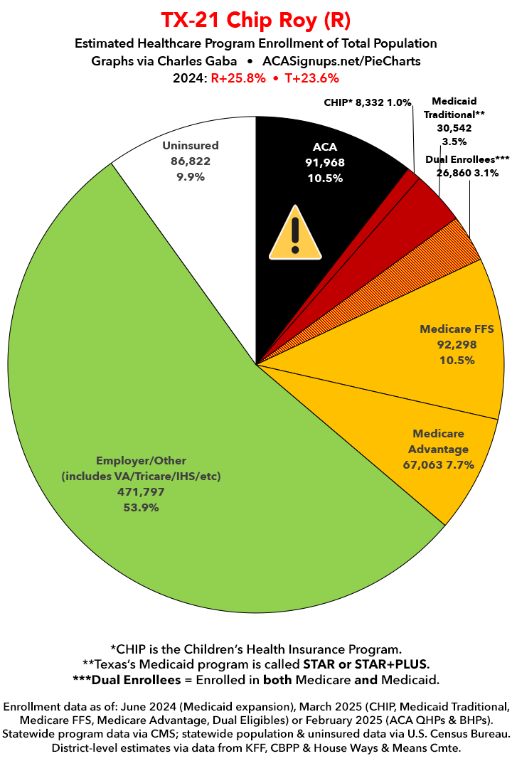 UPDATE 7/14/25: I've updated the web versions of the graphics with the most up-to-date enrollment data I have access to. The black sections w/the ⚠️ symbol are those most at risk of losing healthcare coverage due to H.R. 1, the "One Big Beautiful Bill Act" (aka the #MAGAMurderBill).