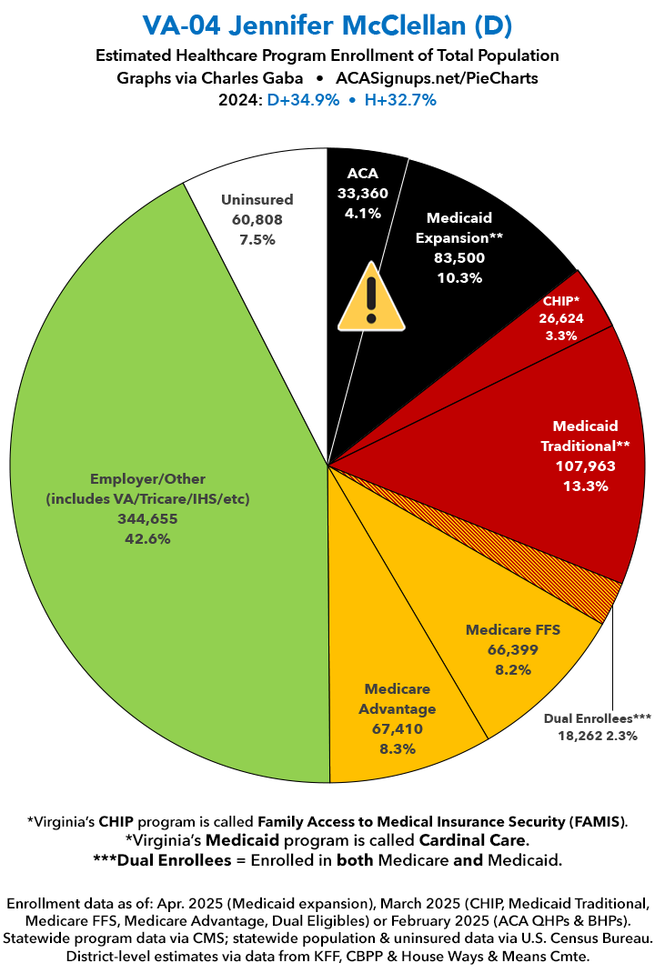 UPDATE 7/15/25: I've updated the web versions of the graphics with the most up-to-date enrollment data I have access to. The black sections w/the ⚠️ symbol are those most at risk of losing healthcare coverage due to H.R. 1, the "One Big Beautiful Bill Act" (aka the #MAGAMurderBill).