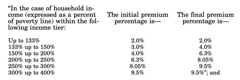If you look at the actual legislative text of the final version of the Patient Protection & Affordable Care Act (PPACA, or simply ACA), the table describing the applicable maximum percentage of income that exchange-based enrollees have to pay for their premiums looks like the table below: