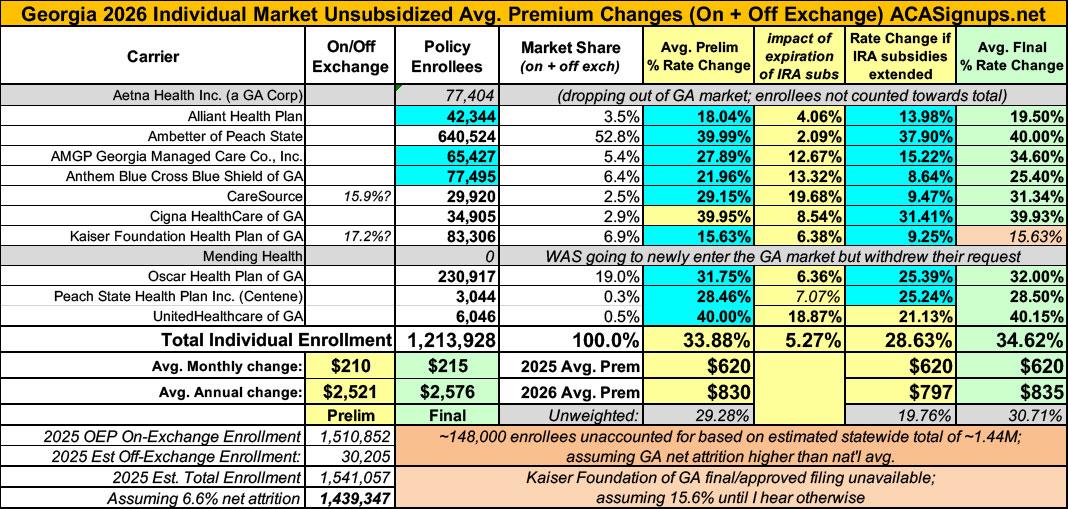 Georgia has around ~1.5 MILLION residents enrolled in ACA exchange plans, 93% of whom are currently subsidized. I estimate they also have another ~30,000 unsubsidized off-exchange enrollees.