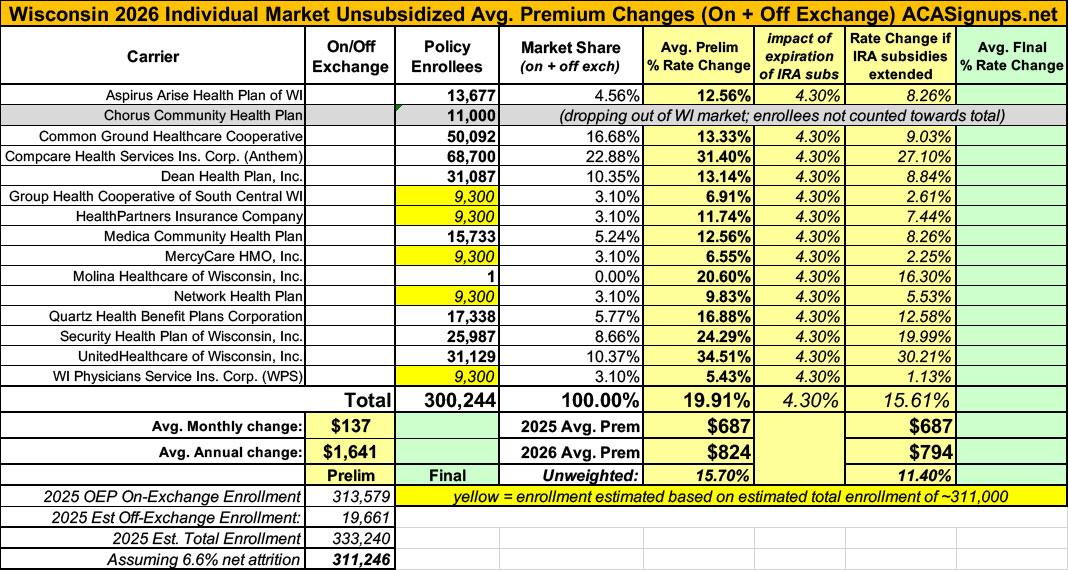 Wisconsin has around ~293,000 residents enrolled in ACA exchange plans, 98% of whom are currently subsidized. I estimate they also have another ~19,000 unsubsidized off-exchange enrollees.