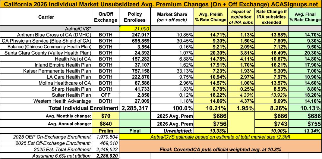 UPDATE 10/5/25: According to the California Insurance Dept. rate review filings site, all of the 2026 individual market filings have been finalized with only nominal tweaks to any of the average rate increases. The overall weighted average drops slightly from 10.2% to 10.1%, although Covered California seems to be sticking with 10.3%, so who knows...