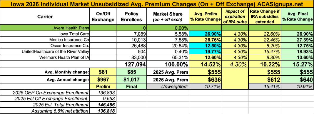 UPDATE 8/14/25: Iowa Total Care, Oscar Insurance and UnitedHealthcare of the River Valley have submitted revised filings bumping up the weighted average increase to 14.5%.