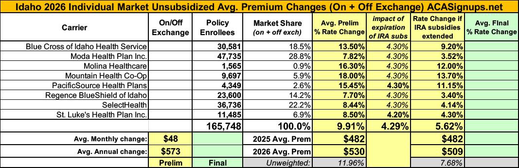 UPDATE 10/01/25: The Idaho Insurance Dept. has published the final/approved 2026 rate filings for both the individual & small group markets.