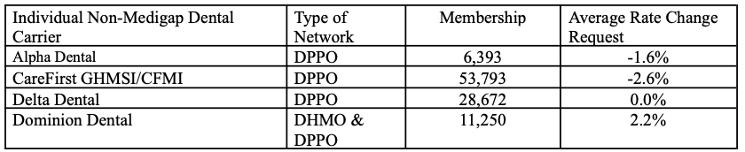 In the small group market, carriers have requested an overall average rate increase of 5.5%, with the averages by carrier ranging from 3.3% to 12.2%. In the individual, non-Medigap, stand-alone dental market, carriers have requested an overall average rate decrease of -1.3% with averages by carrier ranging from –2.6% to 2.2%.