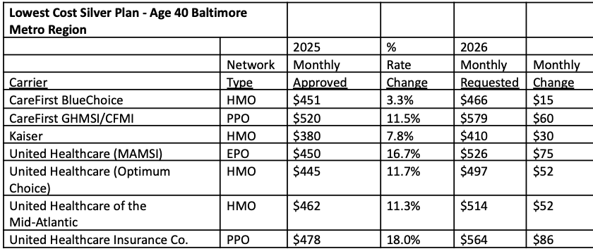To provide context, and for comparison purposes, the chart below shows the filed 2026 monthly individual premium for a 40-year-old in the metropolitan Baltimore service area purchasing the lowest cost silver plan.