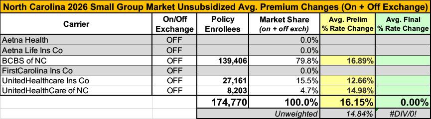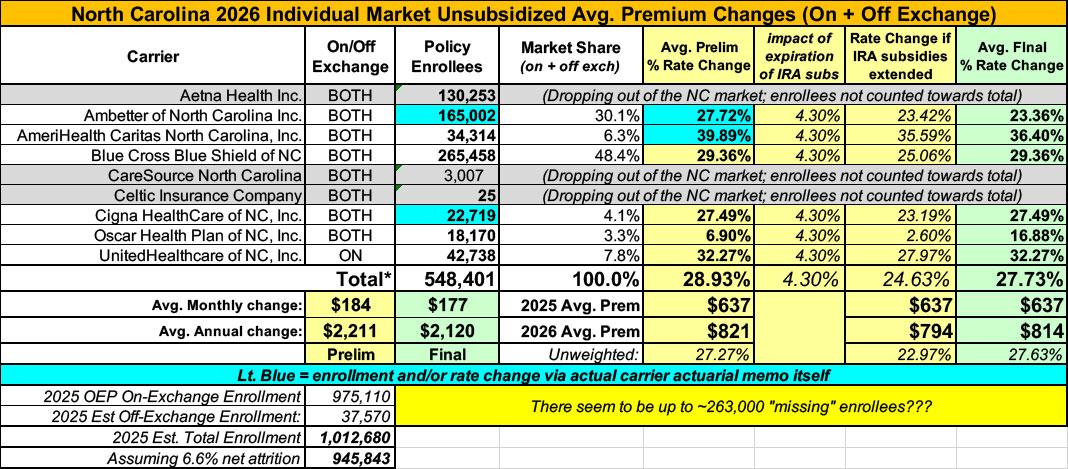 2026 FINAL Gross Rate Changes - North Carolina: +27.7%; what happened to ~263,000 "missing" enrollees?? (updated)