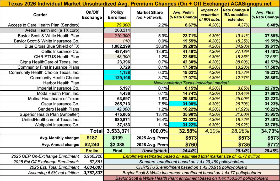 UPDATE 11/02/25: Just hours ahead of Open Enrollment launching, Texas insurance carriers had their final, approved rate filing decisions published to the federal rate review database. In addition to several significant changes to carrier filing averages, I was also able to get the actual enrollment data for two more carriers. Overall, the weighted average rate increase moved up by over two points to +34.7%.