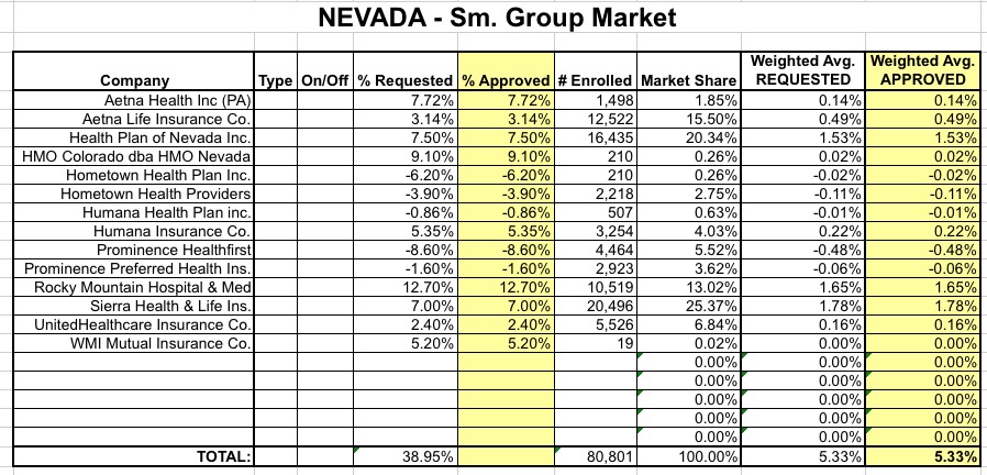 About a month ago, I crunched Nevada's individual and small group rate hike numbers and concluded that the overall weighted average hike in the Silver State next year (assuming everyone stays put and doesn't shop around) will be roughly 9.6% on the individual market and just 5.3% for small businesses.