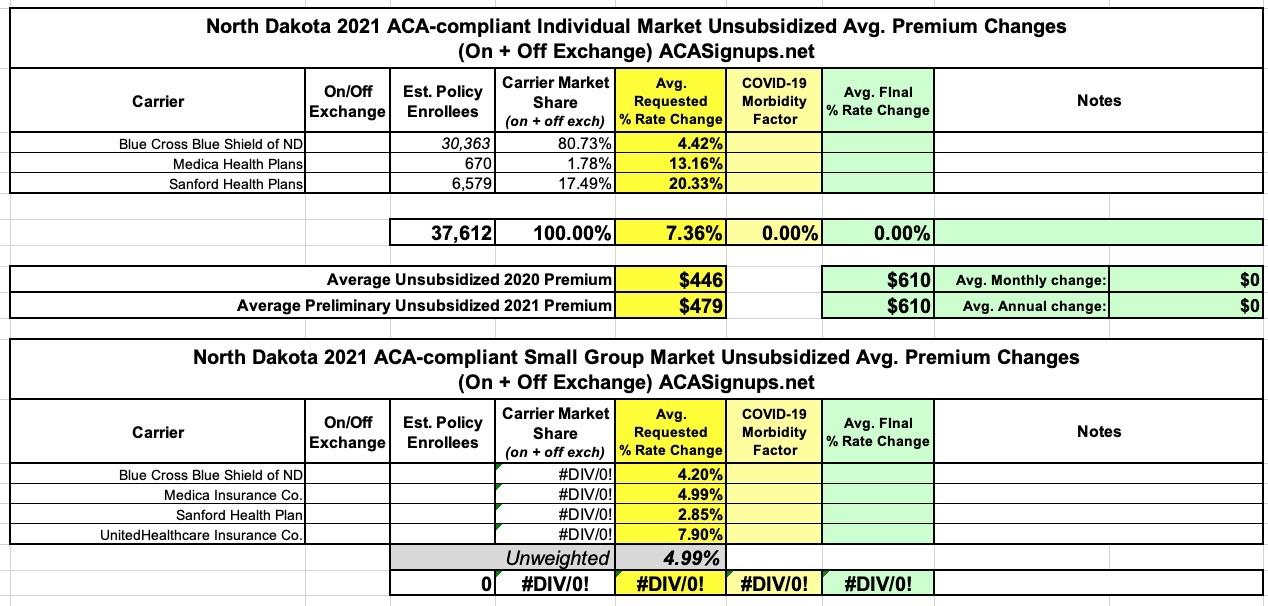A couple of weeks ago I posted North Dakota's preliminary 2021 individual & small group policy premium rate filings, which averaged a 7.4% increase on the individual market and a 4.1% unweighted average increase for the small group market.