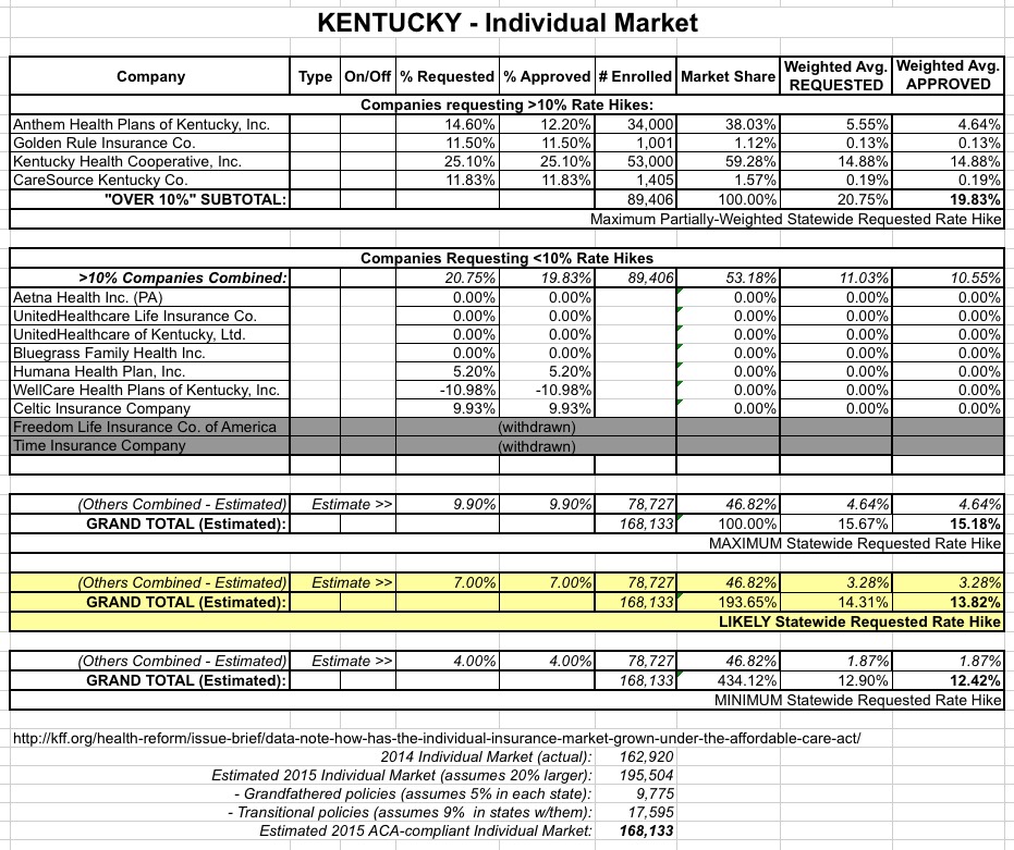 Fortunately, as I explain in the first link above, I've still been able to piece together rough estimates of the maximum possible and most likely approved average rate increase for the Kentucky individual market: