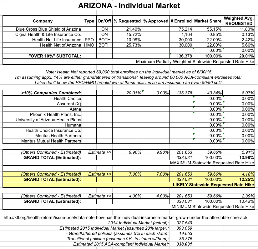 As noted in the table, the Arizona analysis is even more fuzzy than most other states, because the enrollment/market share estimate for Health Net is a guess. According to their Q2 2015 SEC filing (page 49), Health Net had 69,000 people enrolled in individual policies in Arizona as of 6/30/15. They don't break out grandfathered/transitional policies (I'm assuming about 14% combined), nor do they provide a PPO/HMO split, so I'm just going with 50/50, or 60K total ACA-compliant enrollees.
